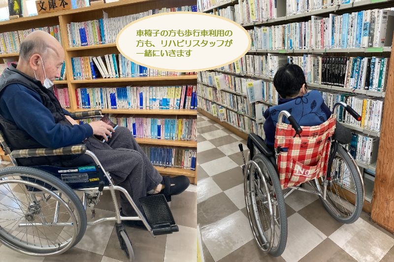 📚📔恒例!図書館ツアー🧑🦽🚶 京都市立図書館では、申し込みをすれば団体貸し出しができます。1団体につき200冊までの図書が4カ月間借りられます。 介護老人保健施設ハーモニーこがでは、リハビリの一環として、15年前から「図書館ツアー」を行っています。 「図書館ツアー」と銘打って、リハビリスタッフがご利用者と一緒に、読みたい本を見つけに行っています。 屋外歩行や車の乗り降りの練習を兼ねたり、図書館の中で好きな本を見つけることができるかなどの評価にもなります。3カ月に1度くらいの頻度で、施設から車で10分のところにある京都市立久我の杜図書館にお邪魔しています。 本が好きだけど図書館には行くことができないご利用者には、前もってどんな本を読みたいかを聞いておきます。1回の利用で150冊程借りるため、リクエスト以外の本はその日に参加したご利用者に選んでいただきます。 冊数が多いので、「この本は、あの人が読むかもしれない」とか「直木賞をとった本を借りていこう」と会話を楽しみながら、本をかごに入れていきます。