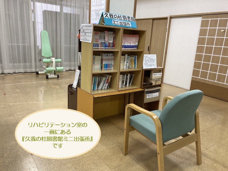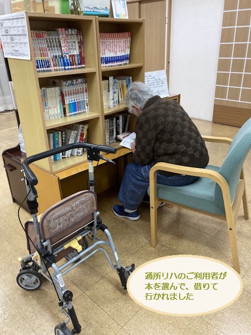借りてきた本は、リハビリ室の一画にある『久我の杜図書館ミニ出張所』に置き、入所中のご利用者や通所リハビリテーションのご利用者、職員も借りられるようにしています。 今回は、日本や世界の歴史を漫画で読める物のリクエストがあり、たくさん借りてきました。